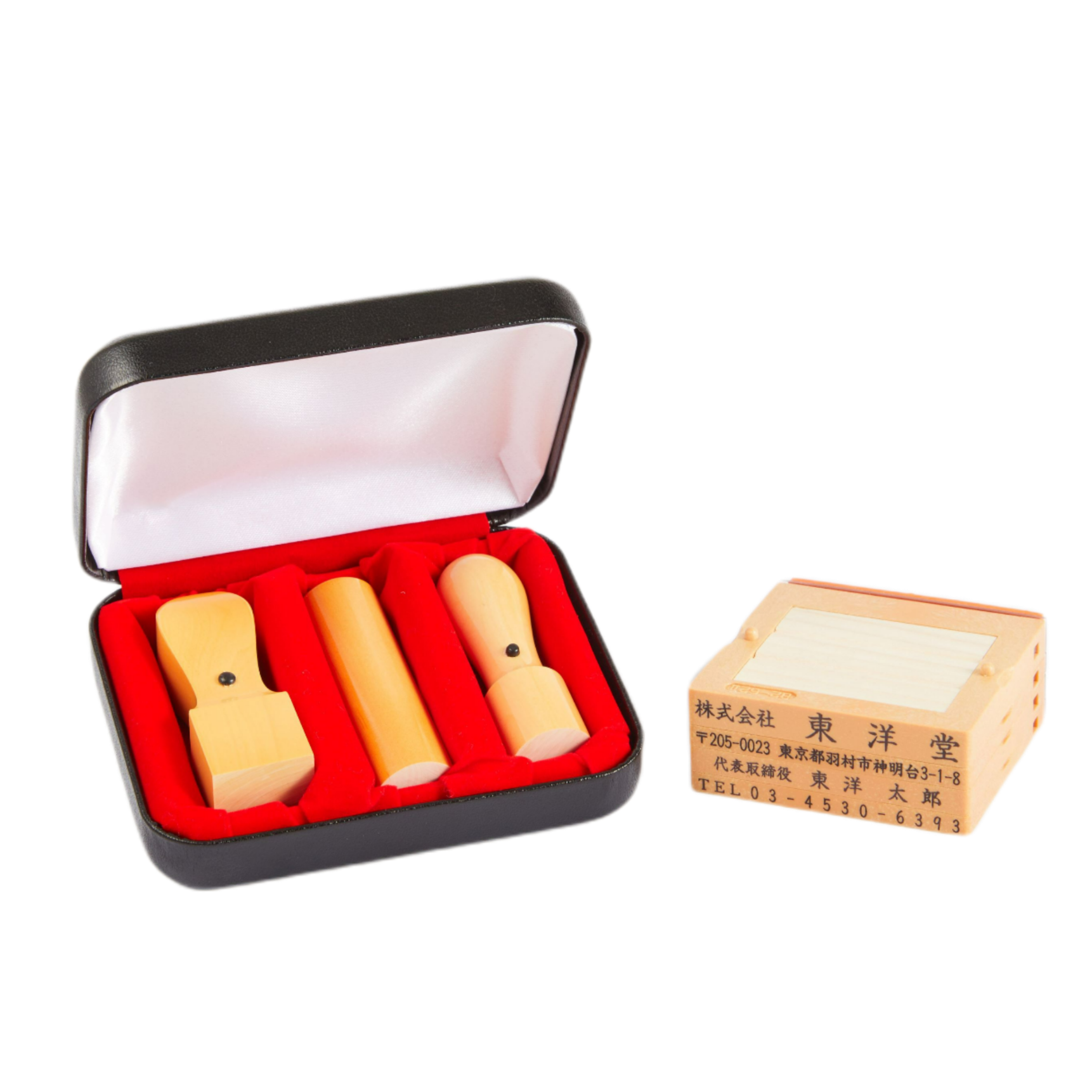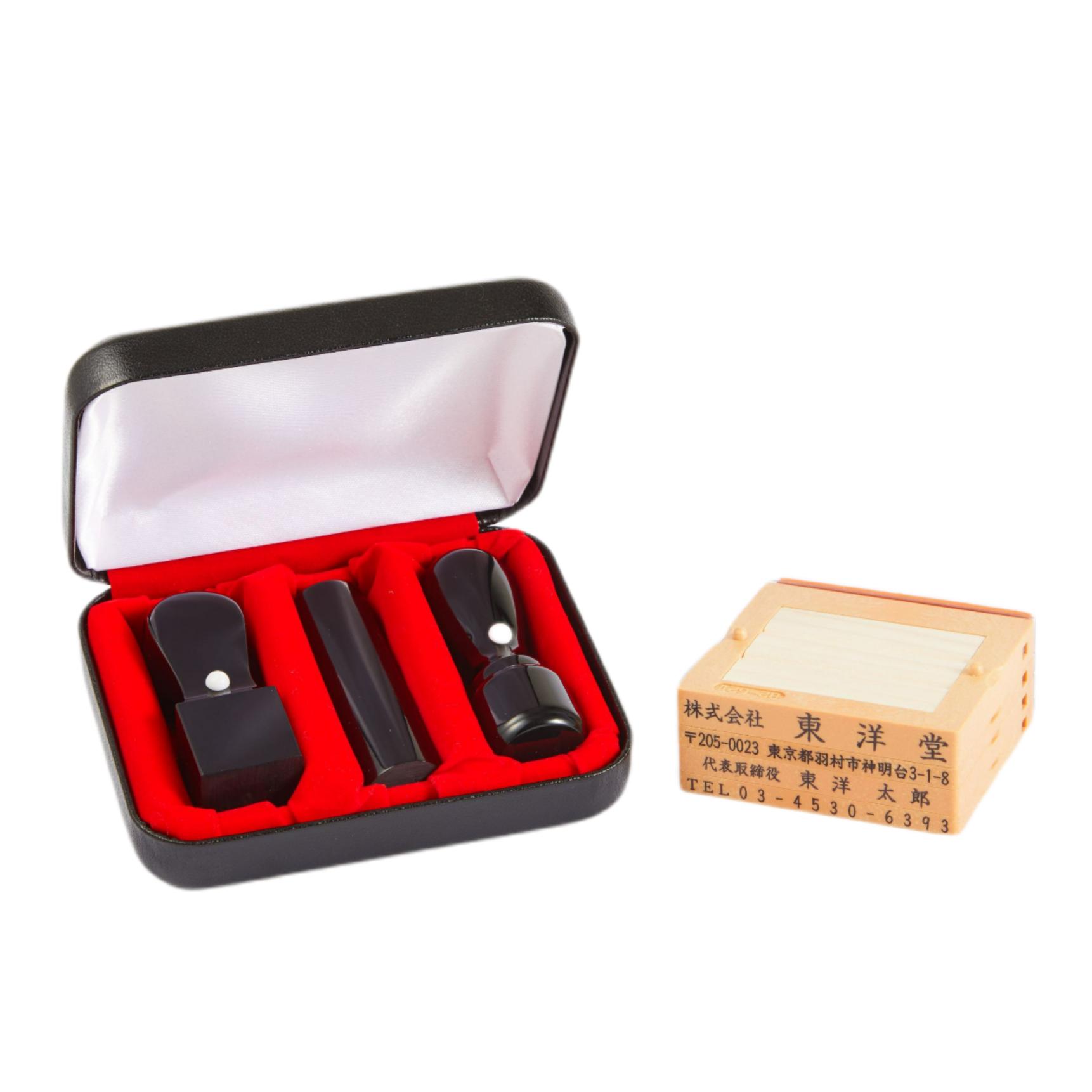 本柘植法人3本セットとそのケース、そしてゴム印がセットになった、大変お得な会社設立4本セットです。